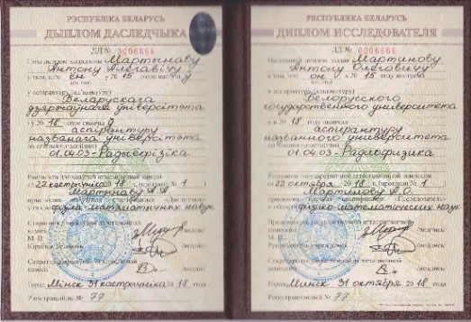 А.О. Мартинову присвоена научная квалификация «Исследователь» в области физико-математических наук (решение государственной аттестационной комиссии от 22.10.2018 г., протокол № 1), регистрационный № 77, г. Минск, 31.10.2018 г.