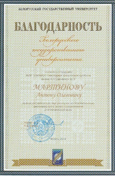 А.О. Мартинов получил благодарность Белорусского государственного университета.