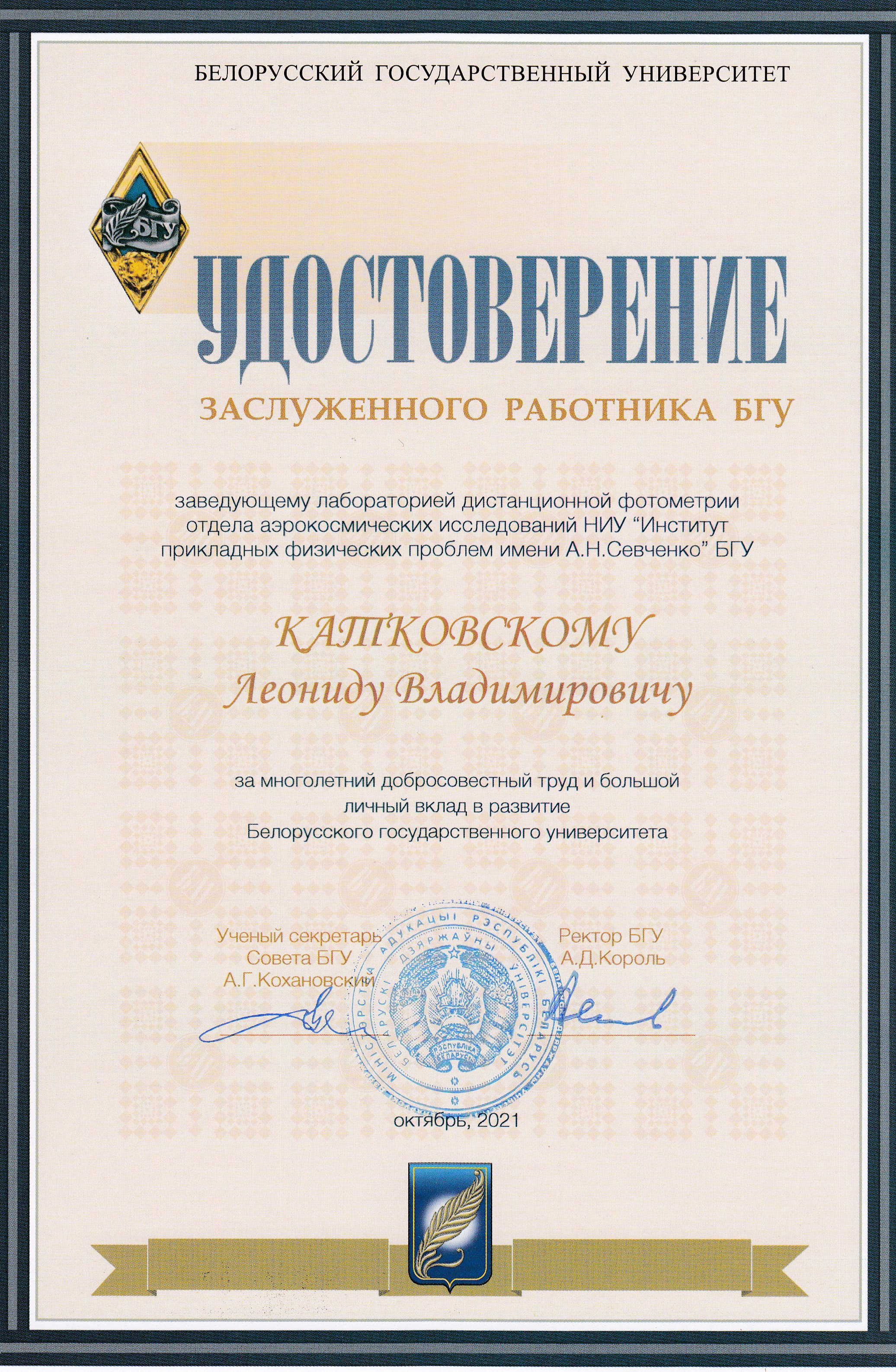 Л.В Катковскому выдано "удостоверение" заслуженного работника БГУ