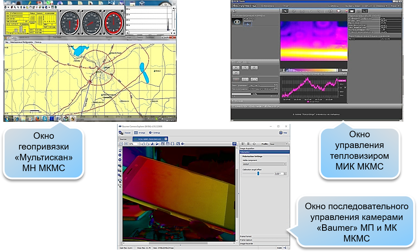 Специальное программное обеспечение СПО «Мультискан» предназначено для управления модулями МКМС и регистрации данных дистанционного зондирования Земли с борта авиационных носителей. Функционально оно делится на ПО геопривязки, записывающее GPS трек полета прибора и отображающее его текущее местоположение на местности, ПО управления тепловизором FLIR Vue Pro, ПО управления камерами «Baumer» (камера визуального сопровождения полёта, поляризационная камера и камера гиперспектрометра), ПО управления приводом вращения поляризационного фильтра и СПО (системное программное обеспечение).