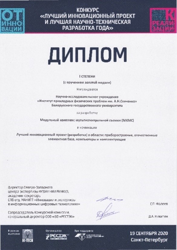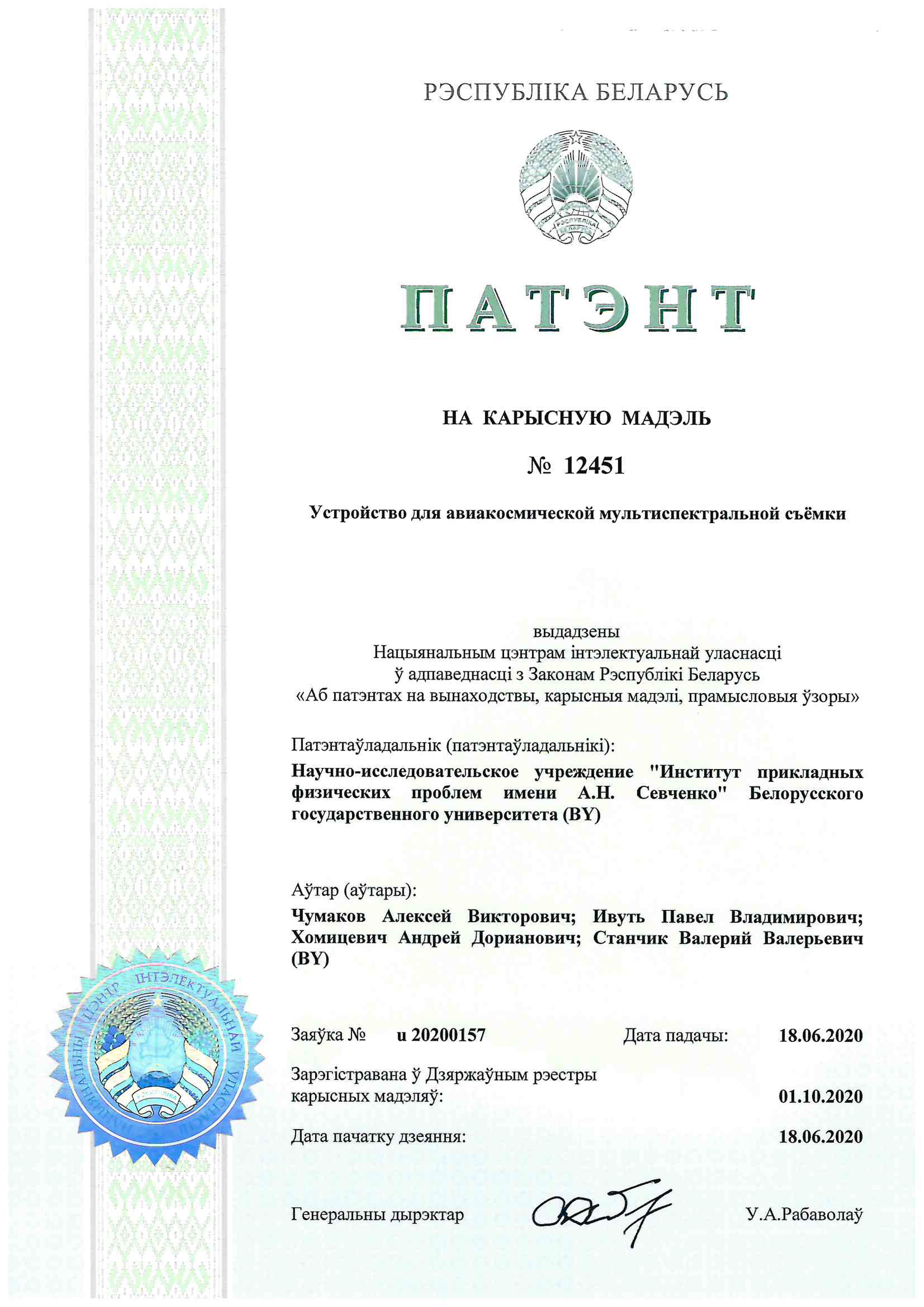 «В ходе выполнения работы получен патент РБ на полезную модель «Устройство для авиакосмической мультиспектральной съемки» № 12451 (дата регистрации 18.06.2020 г.)..