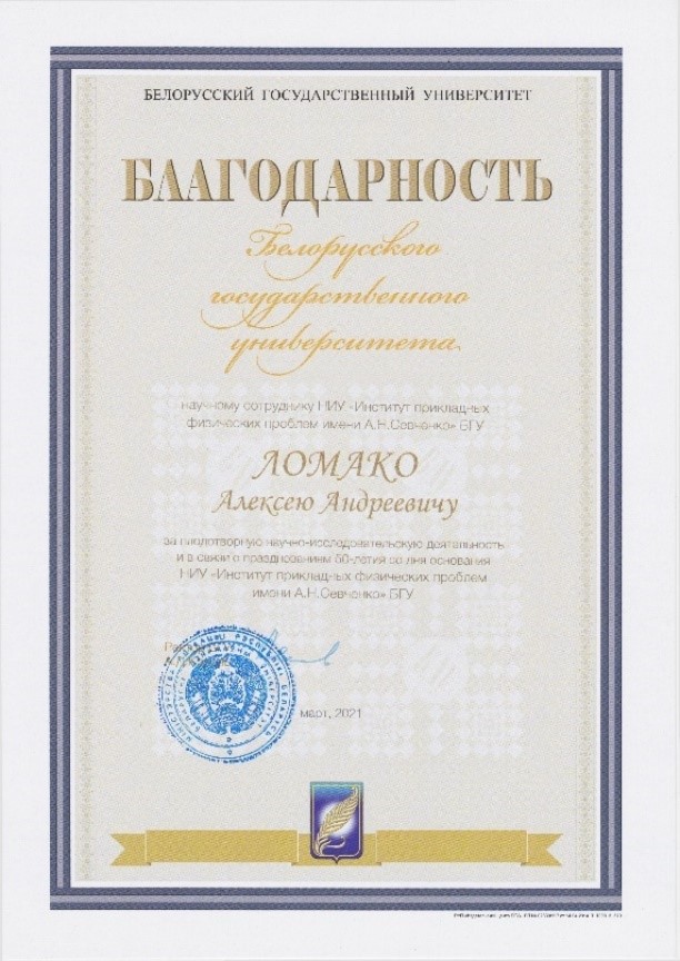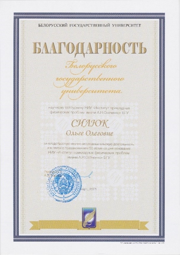 Научные сотрудники отдела А.А.Ломако и О.О.Силюк получили "Благодарность БГУ"