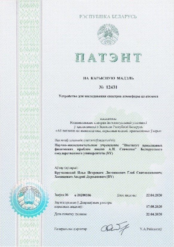 Получен патент Республики Беларусь № 12431 по заявке № u 20200106 на полезную модель «Устройство для исследования спектров атмосферы из космоса» Патент действует на территории Республики Беларусь с 22.04.2020 г. по 22.04.2025 г. (при условии уплаты ежегодных пошлин) с возможностью продления его на 5 лет.