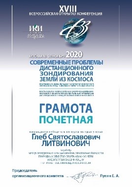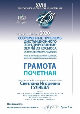 На XVI Всероссийской открытой конференции «Современные проблемы дистанционного зондирования земли из космоса», проходившей 16‑20 ноября 2020 в г. Москва (РФ, ИКИ РАН) сотрудниками отдела было представлено 9 докладов, а Литвиновичу Глебу Святославовичу и Гуляевой Светлане Игоревне были вручены почетные Грамоты, как победителям конкурса молодых ученых за работу: Гуляева С.И., Литвинович Г.С. «Метод определения коэффициентов спектральной яркости природных объектов с борта авианосителя и результаты классификации по типам подстилающей». |