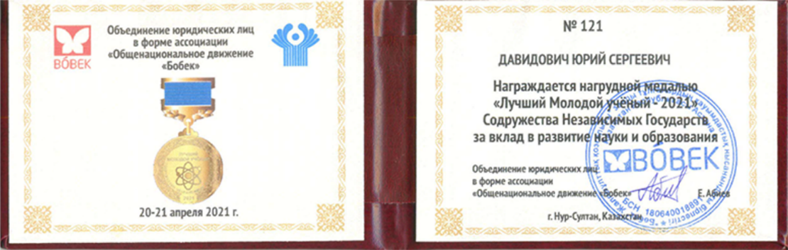 Ю.С. Давидович награжден нагрудной медалью «Лучший молодой ученый-2021» Содружества Независимых Государств за вклад в развитие науки и образования.