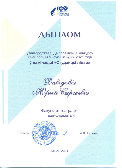 Ю.С. Давидович награжден «Дипломом» факультета географии и геоинформатики БГУ как победитель конкурса «Лучший выпускник БГУ»