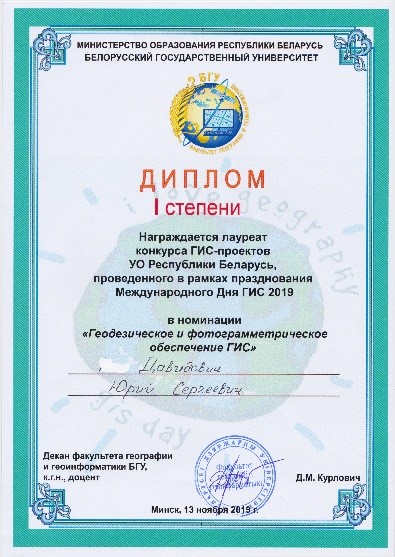Ю.С. Давидович награжден Дипломом I степени в номинации «Геодезическое и фотограмметрическое обеспечение ГИС» в конкурсе ГИС-проектов УО РБ, проведенного в рамках празднования Международного Дня ГИС 2019.