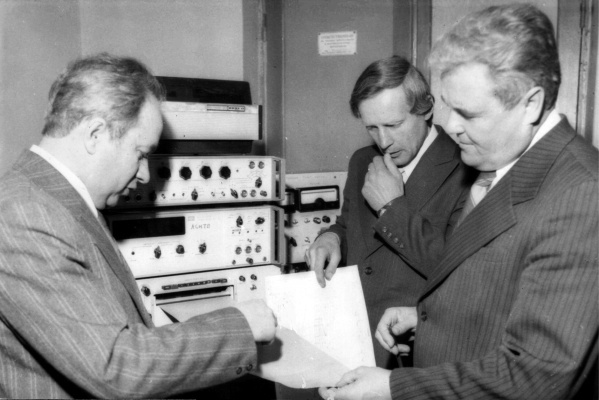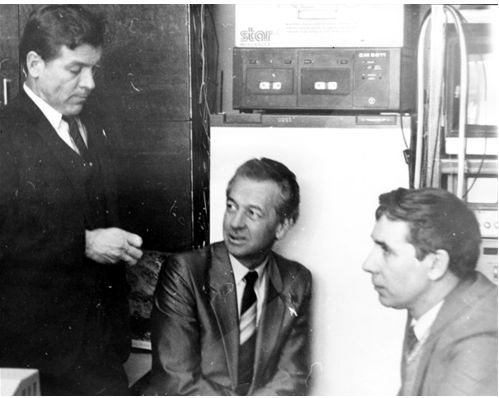 1987 г. Обсуждение конструкции "Гемма-2 видео" в СКТБ с ОП БГУ (слева-направо: А.А.Серебров, В.И.Севастьянов, В.А. Сосенко) Система "Гема 2-видео" была всесторонне испытана на самолете-лаборатории ТУ-134 ЛК ЦПК им.Ю.А.Гагарина в 1987 г. при проведении авиационных научных экспериментов. |