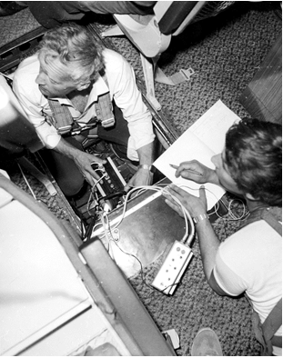 Беляев Б.И и Сосенко В.А с "Геммой-2 видео" ведут измерения через иллюминатор самолета для обработки методик КЭ на борту орбитального комплекса "Мир" |