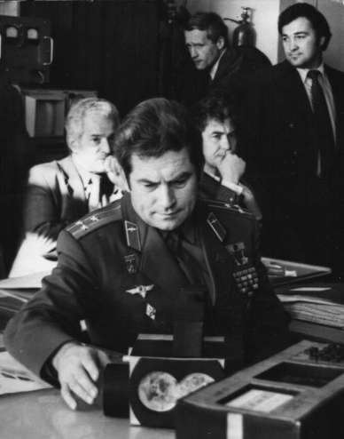 1982 г. Первые обсуждения разработки ручного спектрометра с летчиком-космонавтом СССР, героем Советского Союза (слева направо: В.В.Коваленок, И.Г.Спицин, Б.И.Беляев)