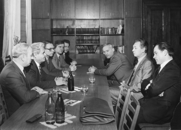 1987 г. Обсуждение у ректора БГУ создания системы «Гемма 2-видео» и научной программы ее использования (ректор БГУ, академик Л.И.Киселевский - второй слева; директор НИИ ПФП БГУ, академик А.Ф.Чернявский - третий слева; летчик-космонавт СССР, герой Советского Союза А.А.Серебров - первый справа; летчик-космонавт СССР, дважды герой Советского Союза В.И.Севастьянов - второй справа; заведующий лабораторией НИИ ПФП БГУ Б.И.Беляев - третий справа)
