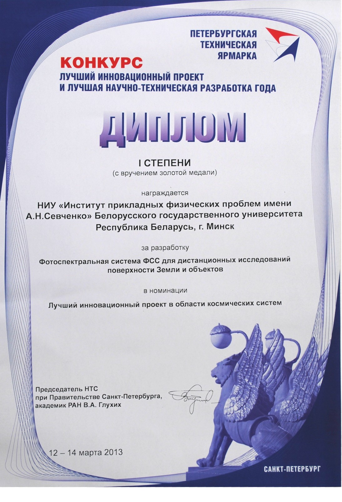 Система ФСС удостоена дипломом I степени и золотой медалью в номинации "Лучший инновационный проект в области космических систем" на Петербургской технической ярмарке (12-14 марта 2013г., г. Санкт-Петербург).