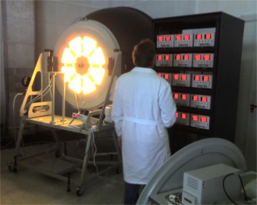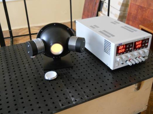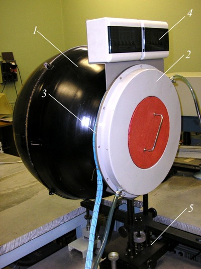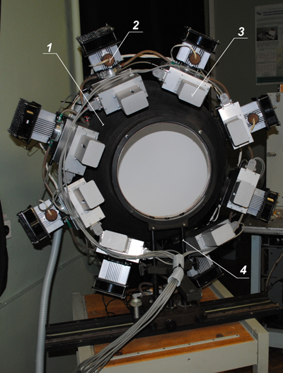 Диффузный излучатель предназначен для создания потока не разложенного в спектр излучения при проведении фотометрических измерений в диапазоне 350-2500 нм. Сфера-8 представляет собой фотометрический шар. Диаметр фотометрического шара связан с диаметром выходного отверстия известным соотношением площадей (Sд/Sсф 0,04). Поэтому для калибровки приборов с достаточно большой апертурой входного объектива было выбрано выходное отверстие диаметром 240 мм, что определило и диаметр фотометрического шара равный 600 мм.