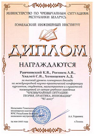 международная научно-практическая конференция курсантов, студентов, магистрантов и слушателей «Чрезвычайные ситуации: теория, практика, инновации» («ЧС-2007»), посвященная 10-летию Гомельского инженерного института МЧС.