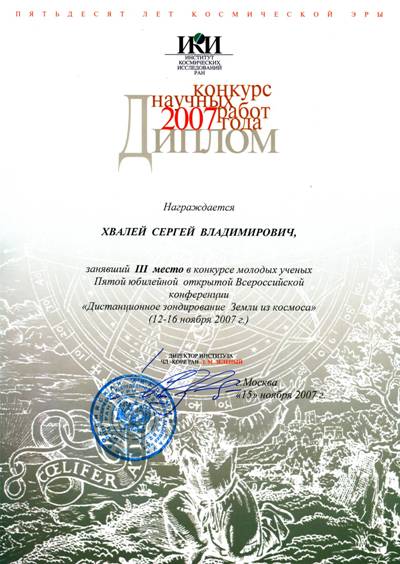 Хвалей Сергей Владимирович награжден дипломом III степени в конкурсе молодых ученых.