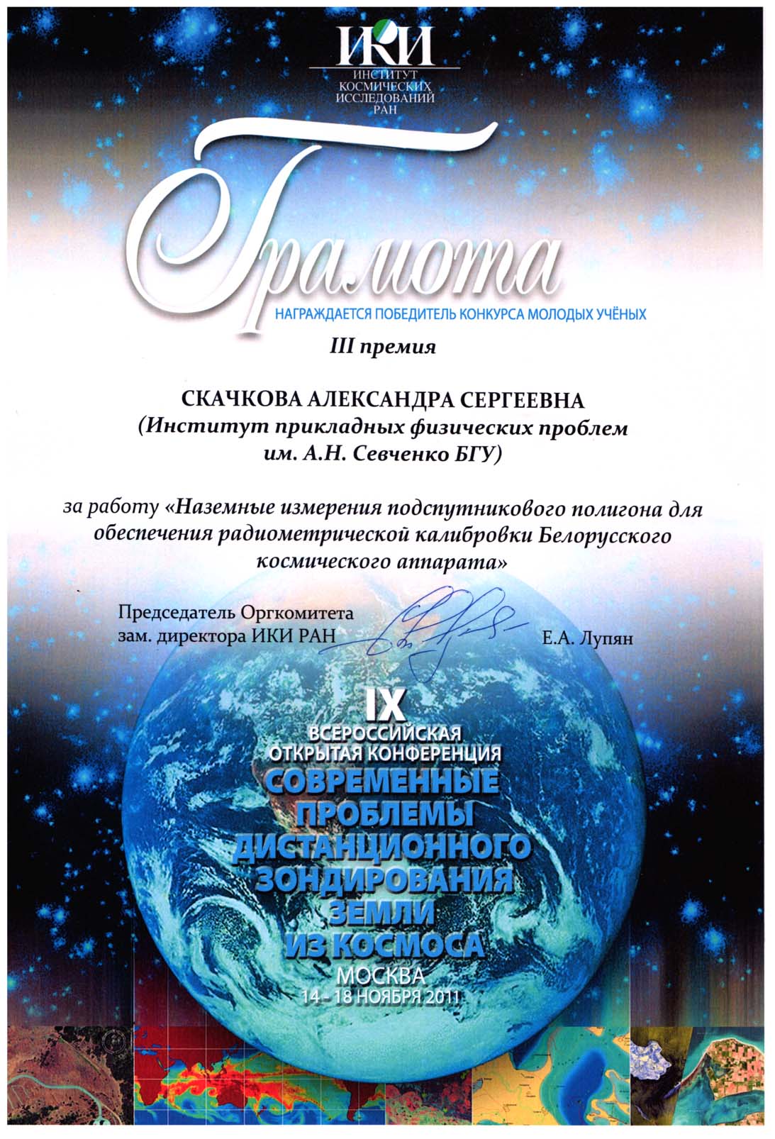 14 - 18 ноября 2011 г. в Москве, в Институте космических исследований РАН состоялась Девятая Всероссийская Открытая конференция «Современные проблемы дистанционного зондирования Земли из космоса (Физические основы, методы и технологии мониторинга окружающей среды, потенциально опасных явлений и объектов)».