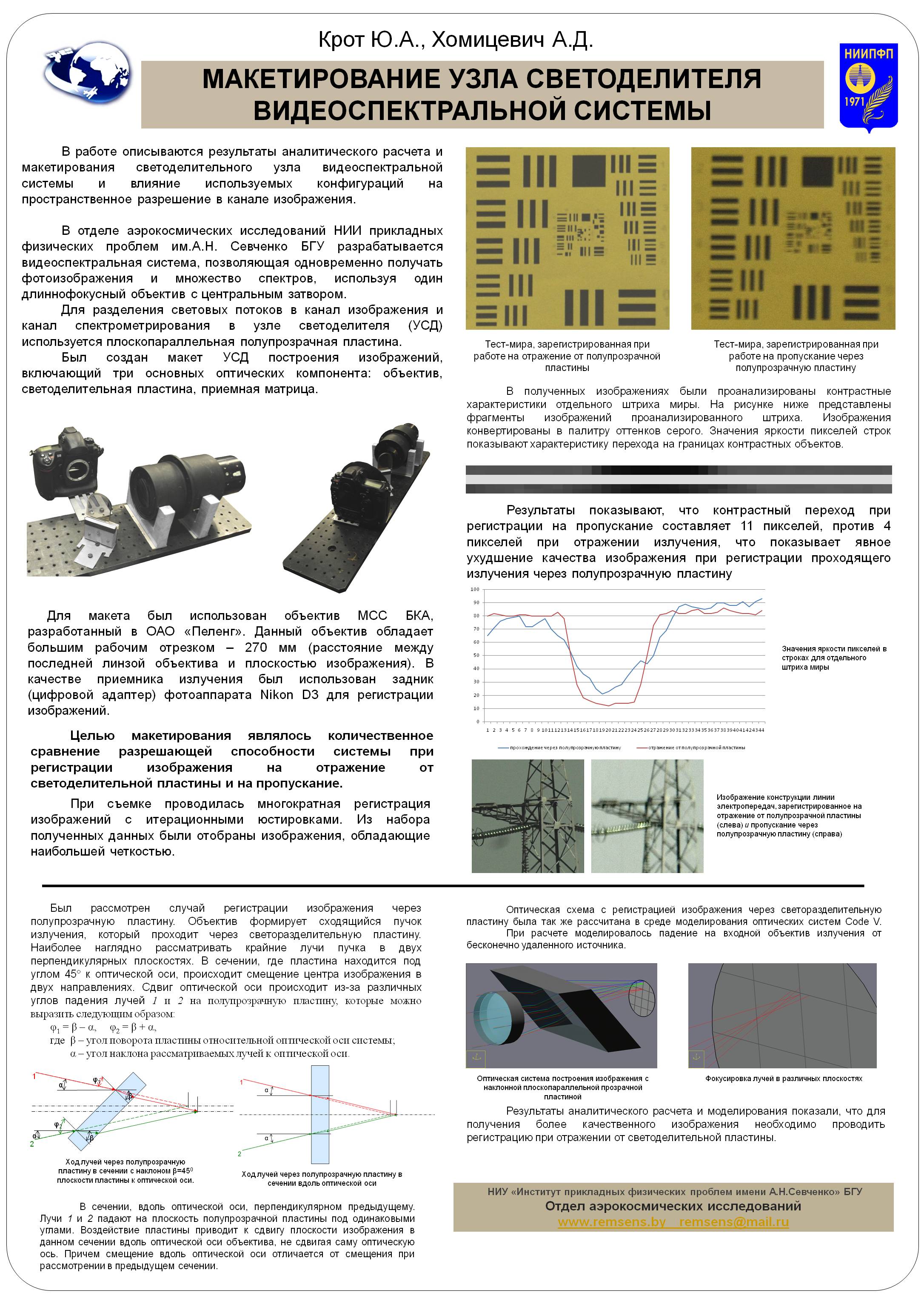 - Методика устранения влияния атмосферы в зарегистрированных из космоса спектрах и ее апробация по наземным данным (Катковский Л.В., Козлова А.А, Попов М.А., Роговец А.В., Скачкова А.С.)