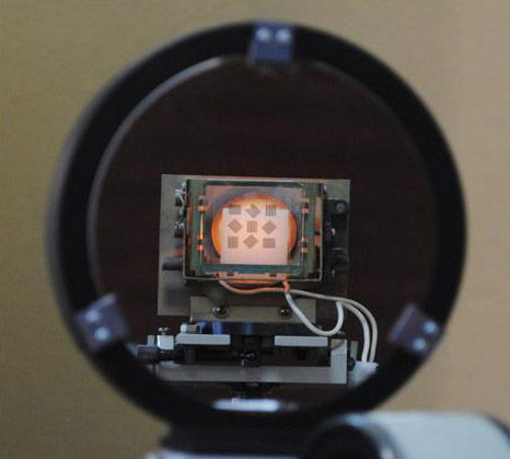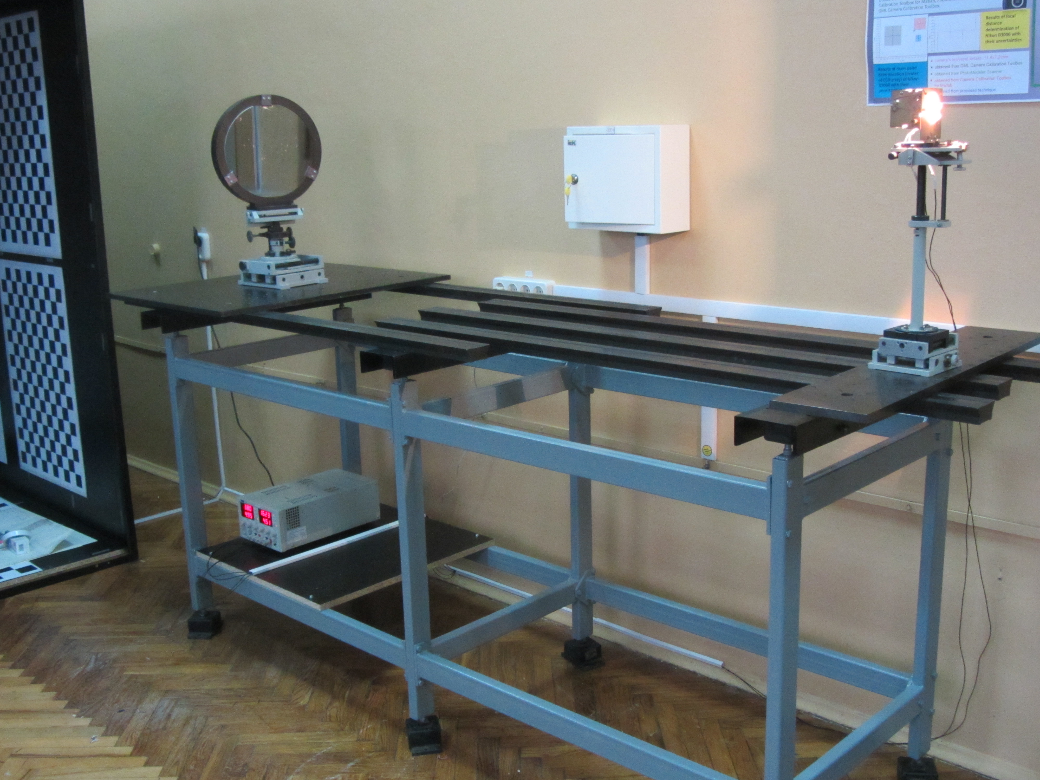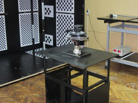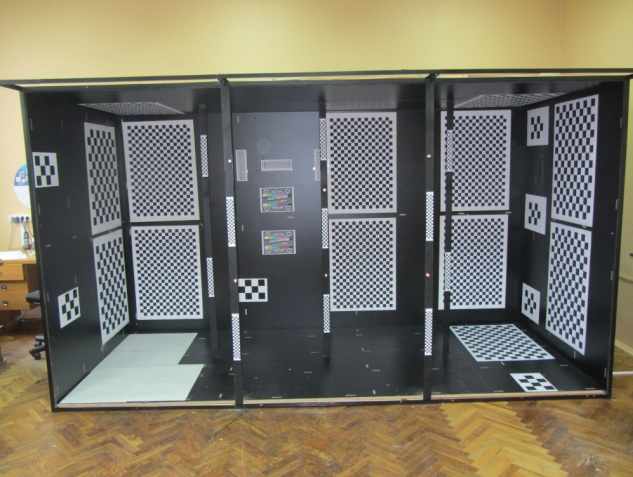 Работы по геометрической калибровке съемочных фотосистем с матричными приемниками излучения ведутся на специально созданном стенде, включающем в себя большое количество (более 4000) опорных калибровочных точек (углы квадратов) с известными координатами. Размеры стенда - 1,5 х 2,0 х 3,6 м. Разработана меодика геометрических калибровок цифровых крупноформатных аэрофотокамер и космических съемочных систем, с помощью которой возможно определение основных параметров фотокамер - фокусного расстояния, координат главной точки, коэффициентов дисторсии, углов полей зрения, углового и пространственного разрешения и частотно-контрастной характеристики фотокамеры.