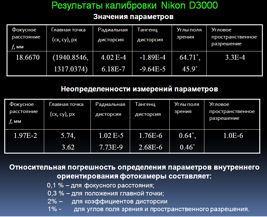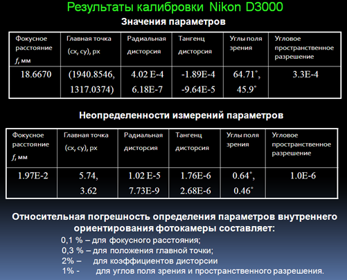 Ниже приведен пример калибровки фотоаппарата Nikon d3000 со следующими паспортными характеристиками: фокусное расстояние объектива f=18 mm, координаты главной точки (1936, 1296) px.